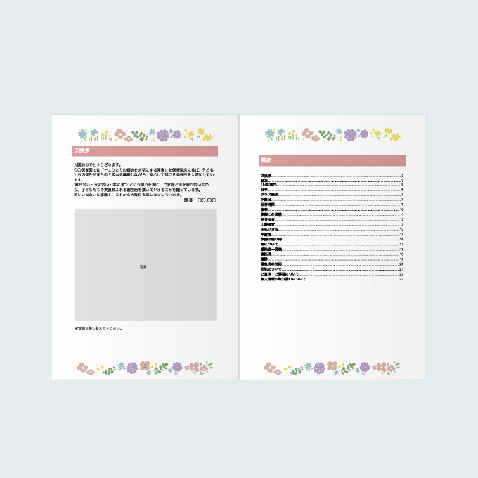パンフレット・入園のしおり・重要事項説明書・子育て支援イベントのチラシ・園だより・献立表・行事予定表・そのほかお便り・園児募集ポスター・求人ポスターなどなど…保育園・幼稚園では日々いろいろな「資料」を印刷します。